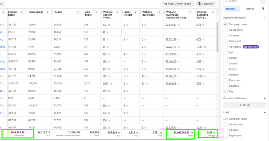 Budget: $262,983.99Results: 5.56x ROAS in 30 daysHow: Focused scaling on cold audiences. Instead of small 20% budget bumps, I increased spend by 2–5x on proven creatives with strong metrics